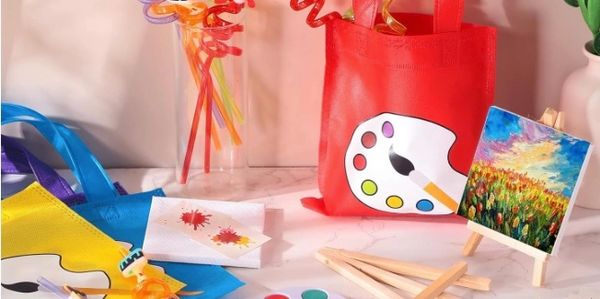 For the art lovers out there! Artsy Canvas Tote includes Mini painting panels , watercolor paints and pens, Art painting straws , Key chains, Art themed stickers, slap bracelet, and candy.