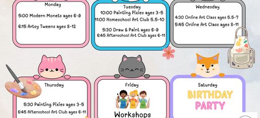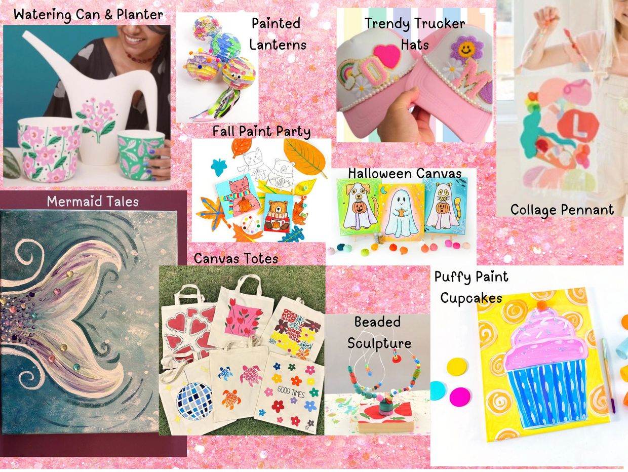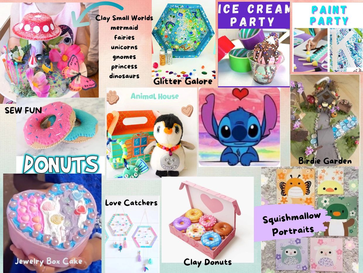 Enchanted Pixie Bash Package $597 Sit back and relax, the party is all set! This package takes care of everything! Decorations, a fun and creative art experience, food, dessert and drinks with 2 full hours in the art studio. A 1 hour art experience of your choice, plus 1 hour for food & gifts. This package is for 12 guests. Package includes a goody bag for each guest up to 12 artists, 3 large pizzas from Mr. Y's and juice boxes and water, a dozen cookies (choose from 11 flavors) or brownies from Love Cookie Co., all paper products. Additional cookies/brownies $4 each. Additional pizzas $20 each. Each additional guest is $30, maximum of 18 artists. Parties are held on Saturday's only. Email me to collaborate schedules! The pictures below are a spring board of ideas for your project selection -choose one of the projects. Customized projects additional $50. I custom design a personalized mural for the guest of honor too! Goody bags for your guests choose from selection below. This package includes 12 goody bags, additional bags $10 each.